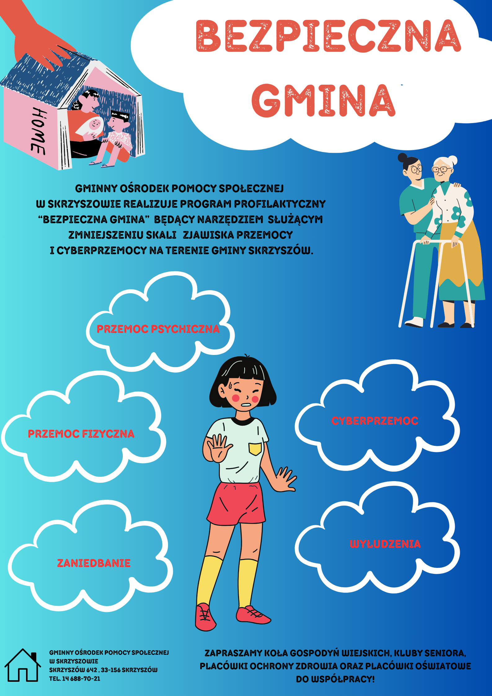 Celem projektu jest edukacja w zakresie zjawiska przemocy domowej, rówieśniczej, cyberprzemocy oraz innych niekorzystnych zjawisk (np. oszustwa, wymuszenia) kierowana do najbardziej narażonych na tego typu zjawiska grup społecznych. Program uwzględnia również aspekt poszerzenia wiedzy i podniesienia kompetencji osób działających w systemie przeciwdziałania przemocy.