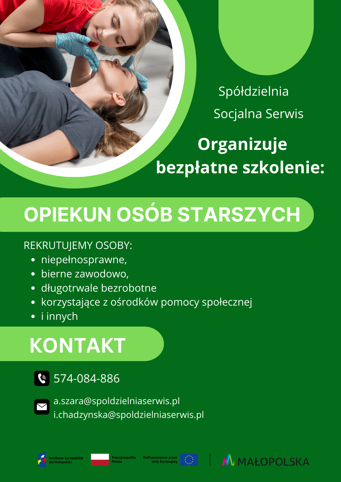 Szanowni Państwo, Spółdzielnia Socjalna Serwis z przyjemnością ogłasza rozpoczęcie rekrutacji na Kurs Pomocy Osobom Starszym, który ma na celu przygotowanie uczestników do pracy z osobami starszymi i niepełnosprawnymi. Kurs ten jest idealnym rozwiązaniem dla osób, które chcą zdobyć wiedzę i umiejętności niezbędne do opieki nad seniorami oraz osobami wymagającymi wsparcia.